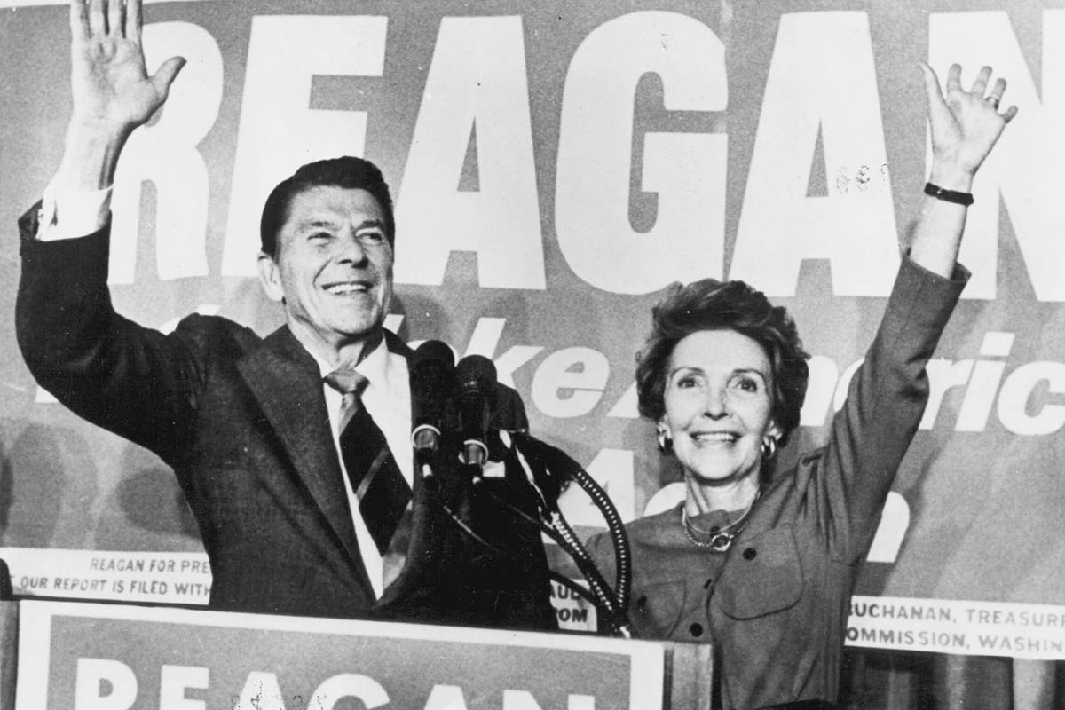 Ronald Reagan et sa femme Nancy saluant leurs électeurs le soir de la victoire, le 4 novembre 1980. Photo12/Keystone Pressedienst
