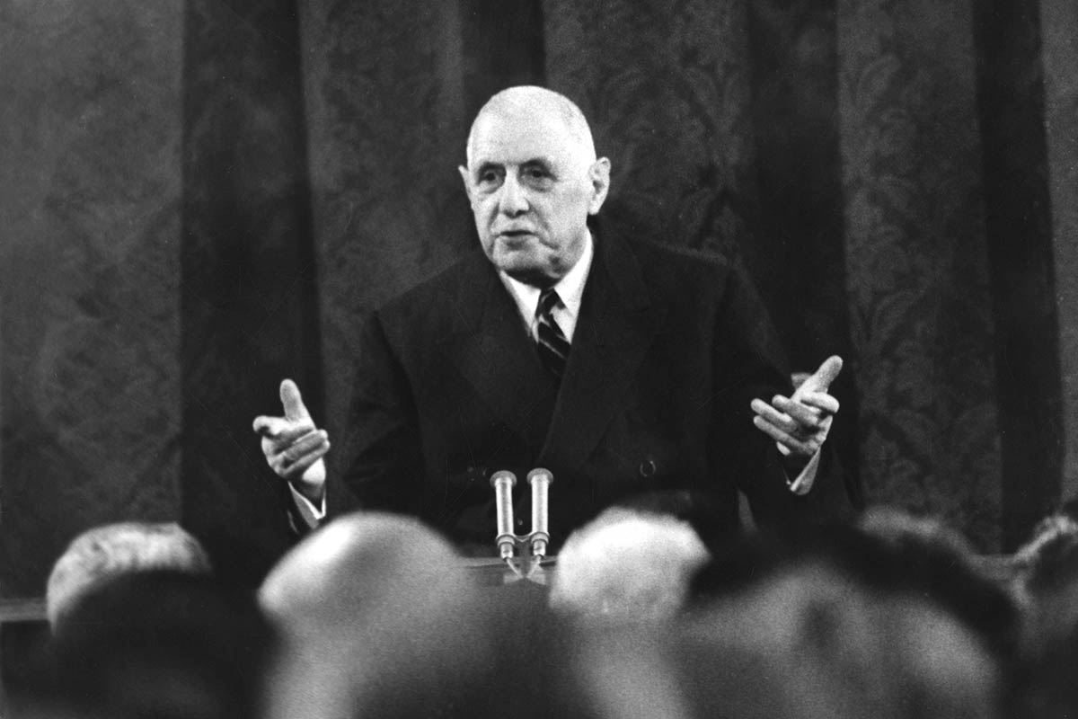 Le président de la République Charles de Gaulle lors d'une conférence de presse en 1965.