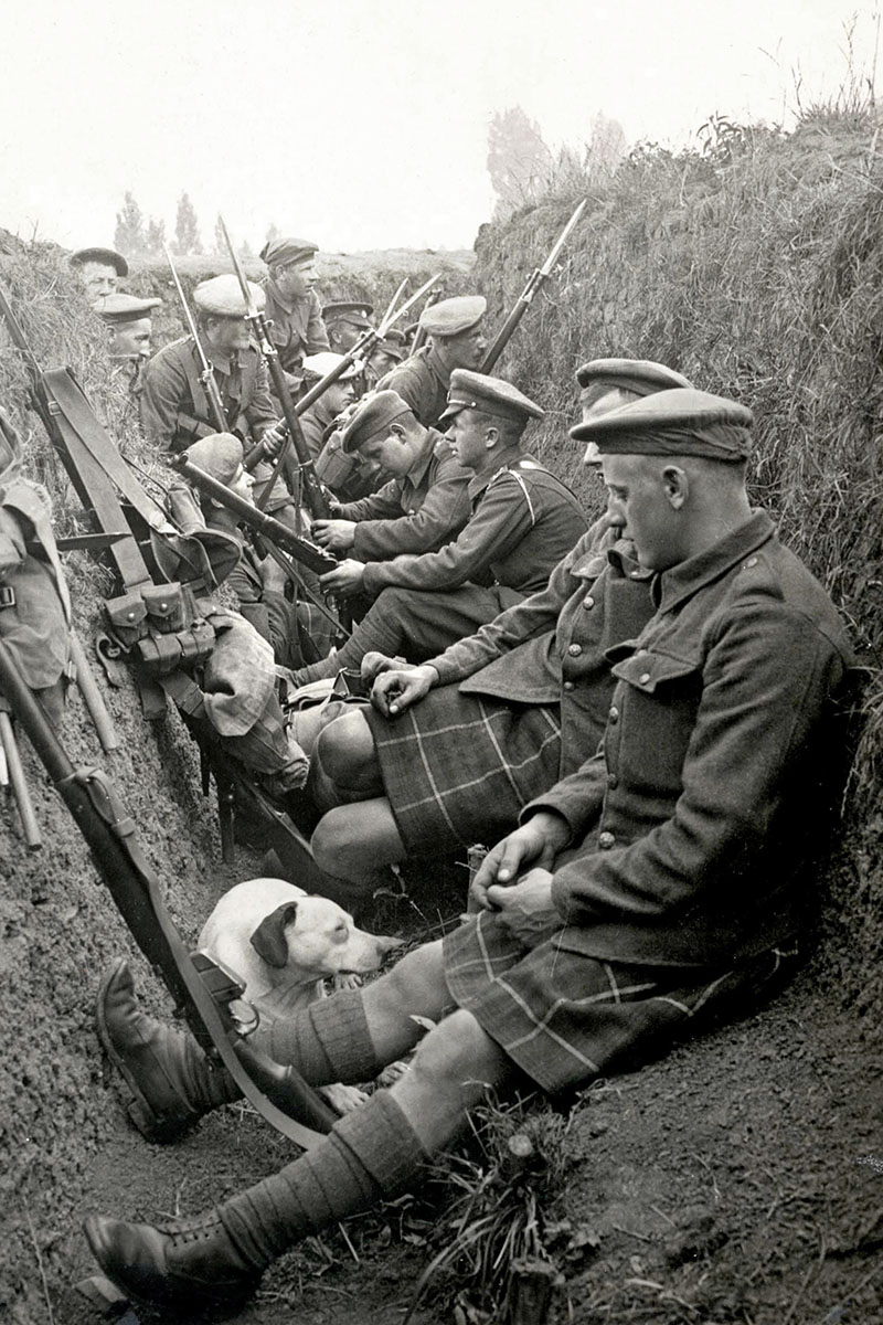 Soldats territoriaux des Highlands dans une tranchée avec leur chien mascotte. Nord de la France, vers 1916.