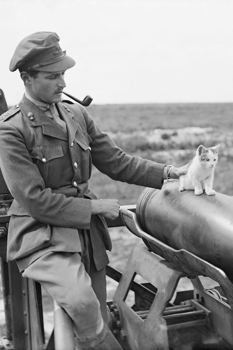 Un officier de la 444e batterie de siège de la Royal Garrison Artillery caresse un chat perché sur un obus, près d'Arras, le 19 juillet 1918.