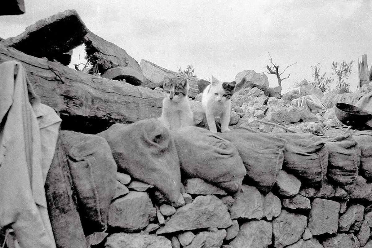 Chatons dans une tranchée française en 1916 utilisés pour combattre les rats. Photo12/L'Illustration