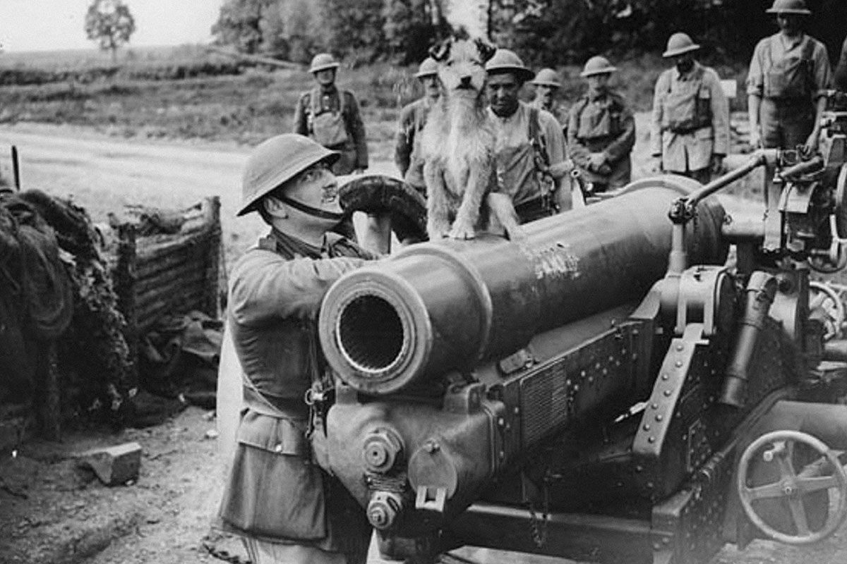 Un chien trône fièrement sur un canon de campagne, en France, lors de la Première Guerre mondiale. Photo12/Alamy