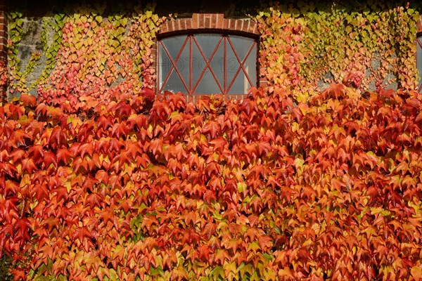 Virginia Creeper (Parthenocissus quinquefolia) on wall, autumnal colours, Scania, Sweden, Europe