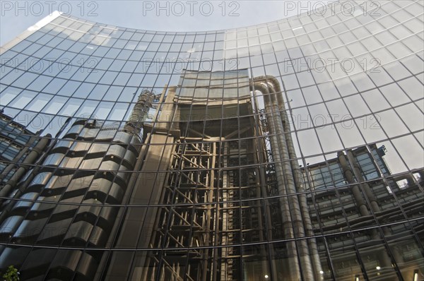 Lloyd's Building, or Inside-Out Building, reflected in facade of Willis Building, London, London region, England, United Kingdom, Europe
