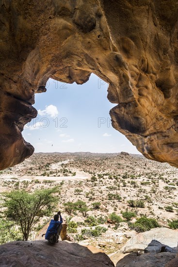 Local guide sitting in one the Laas Geel caves, Somaliland, Somalia, Africa