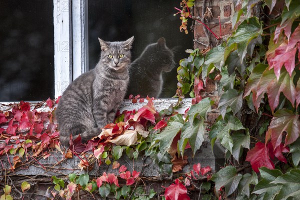 Domestic cat, fence vine (Parthenocissus), mackerel