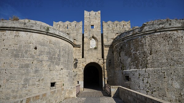 Emery d 'Amboise Tor, city wall of Rhodes, entrance of a medieval fortress with massive stone walls and towers, under blue sky, Rhodes Old Town, Rhodes Town, Rhodes, Dodecanese, Greek Islands, Greece, Europe