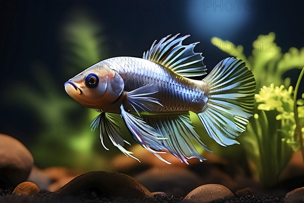 Single betta fish swimming gracefully in a minimalist nano tank encircled by delicate aquatic plant, AI generated