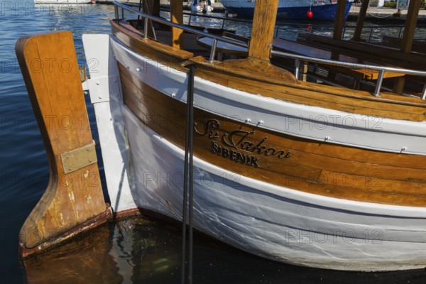 Rudder on docked white painted and varnished wooden boat in harbour in late summer, Sibenik, Croatia, Europe