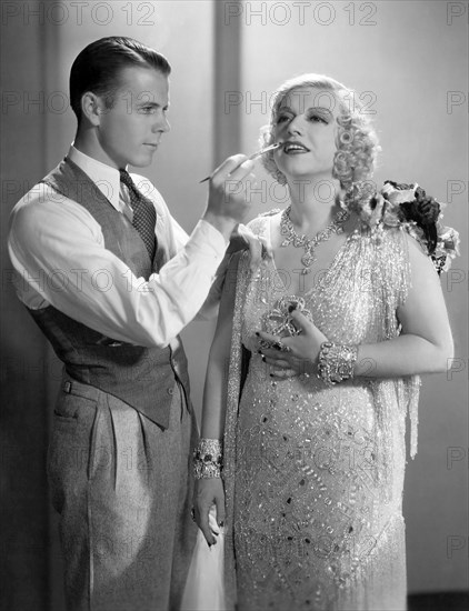 Texas Guinan, having her makeup touched up, on-set of the Film, "Broadway Through a Keyhole", 20th Century Fox Film Corp., 1933