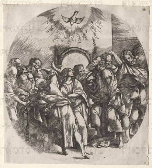 The descent of the holy spirit, 1518. Domenico Campagnola (Italian, 1500-1564). Engraving