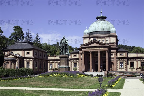Kaiser Wilhelm spa hotel, built in 1890 as a royal spa, bath and therapy centre, a statue of Kaiser Wilhelm I in front, spa gardens, Bad Homburg, Hesse, Germany, Europe