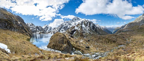 View into Route Burn Valley, Route Burn River tiling from Lake Harris, Conical Hill, Routeburn Track, Mount Aspiring National Park, Westland District, West Coast, South Island, New Zealand, Oceania