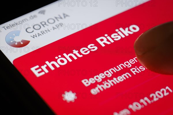 The Corona Warn app displays the words Increased Risk on a smartphone. Berlin, 23.11.2021, Berlin, Germany, Europe