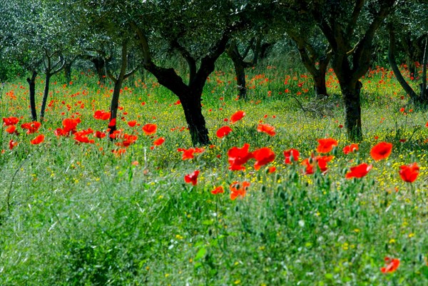 Near Terni meadow with Red Poppies (Papaver Rhoeas) and Olive Trees, Umbria, Italy, Europe