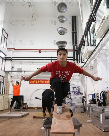Shangaî. Mars 2017 - Un étudiant de la ville de Xinjiang s'entraîne à l'École de irque de Shangaï. L'école de cirque de Shanghai, construite en 1989, est l'une des plus anciennes écoles de formation en acrobatie en Chine. Il y a au total 45 étudiants du Xinjiang, qui seront diplômés en juillet et donneront des spectacles au public dans leur ville natale