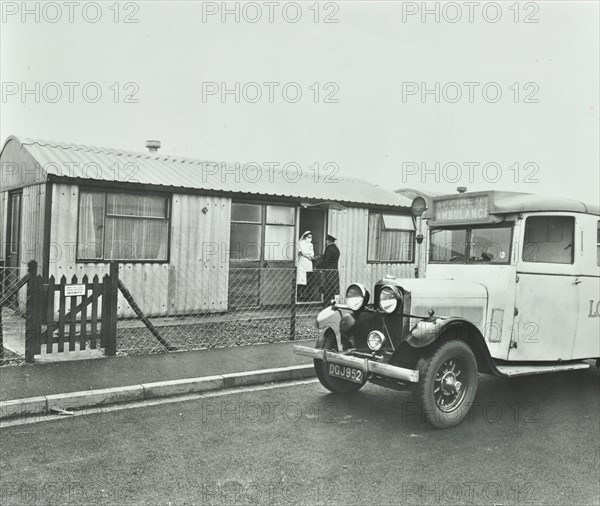 Ambulance delivering a gas and air cylinder, Woolwich, London, 1946. The ambulance driver is handing over the cylinder of gas to a midwife at a prefabricated bungalow.