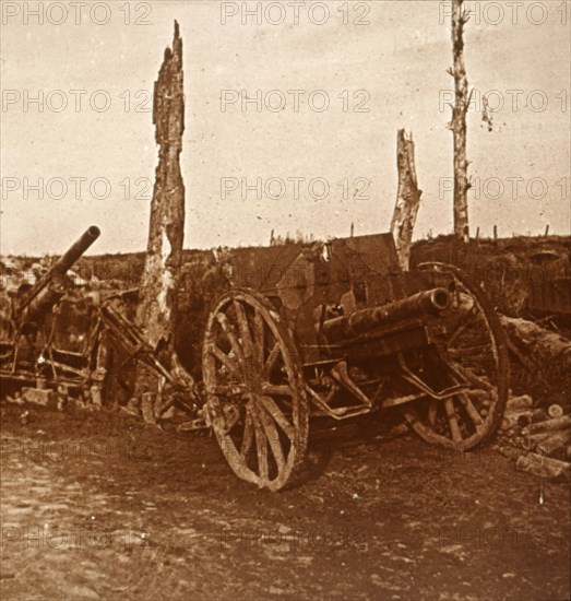 Abandoned 'enemy' [German?] cannons, c1914-c1918. Photograph from a series of glass plate stereoview images depicting scenes from World War I (1914-1918).