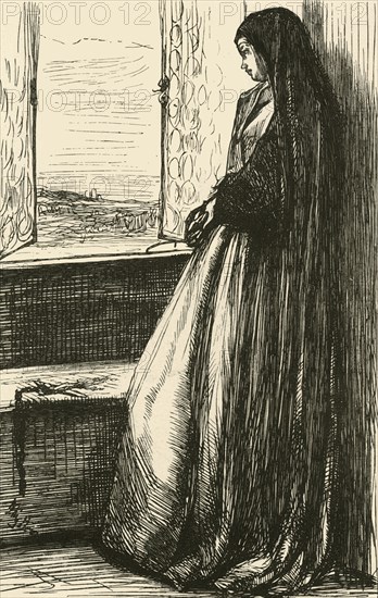 'From "Count Burkhardt".', 1862, (1928). Nun by a window. Illustration to the poem "Count Burkhardt" by EL, published in "Once a Week", vol 7 (June-December), [Bradbury & Evans, London, 1862]. Later published in "Illustrators of the Sixties" by Forrest Reid, [Faber & Gwyer]. From "The Bookman - Special Christmas Number 1928". [Hodder & Stoughton Ltd, London, 1928]