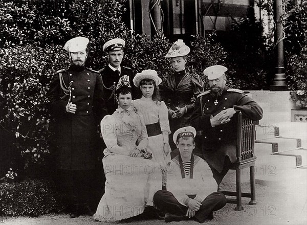 The Russian Imperial family, c1892-c1894. Tsarevich Nicholas (1868-1918), Grand Duke George (1863-1919), the Empress Maria Feodorovna (1847-1928), Grand Duchess Olga (1882-1960), Grand Duchess Xenia (1875-1960), Grand Duke Michael (1878-1918) and the Emperor Alexander III (1845-1894). Found in the collection of the Russian State Film and Photo Archive, Krasnogorsk.