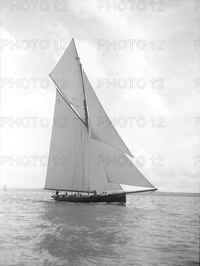 The gaff rigged cutter 'Bloodhound' sailing close-hauled, August 1911. The 40 ton cutter, 'Bloodhound' was designed by William Fife and built in 1874. Owned by the Marquis of Ailsa she had a successful racing career, winning 142 prices between 1909 and 1914.