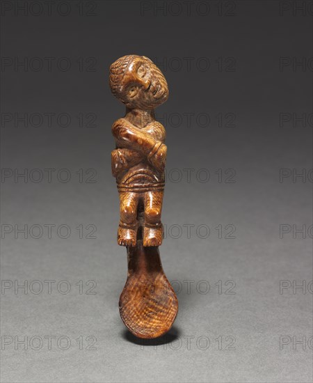 Female Figurine, late 1800s-early 1900s. This female figurine may be a fragment of a spoon or spatula, but this claim cannot be confirmed. Although the iconography of the human image is not uncommon in the art of the Yombe and related Kongo-speaking peoples, it does not reveal the object's function or purpose. The position of the arms has been interpreted as that of a bound prisoner while the head, tilted horizontally or at an angle, represents a broken neck or even a severed head, thus identifying the prisoner as a sacrificial victim. Yet, despite the large quantity of Yombe- and Kongo-attributed works in collections, as well as the vast body of literature on the subject, their culture, history, and art, many questions remain unanswered and our knowledge continues to be fragmented and superficial.