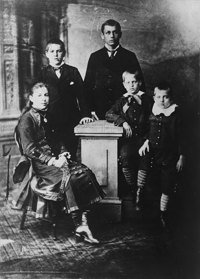 The Garfield children, c1881, printed later?. Full-length group portrait of (President) James Garfield's children, from left, Mollie, James, Harry, Irvin, and Abe. [Mollie Garfield, James Rudolph Garfield, Harry Augustus Garfield, Irvin McDowell Garfield and Abram Garfield].