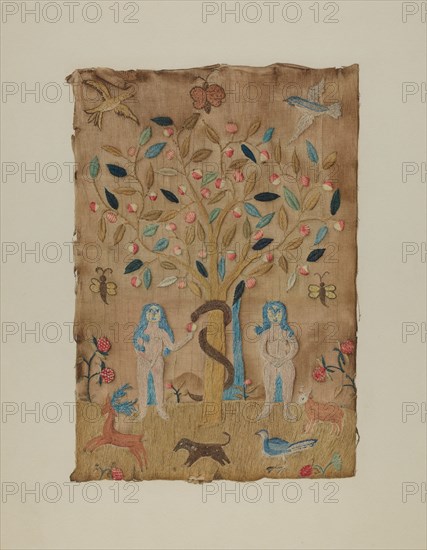 Adam & Eve Embroidered Picture, c. 1938. Creator: Martha Elliot.