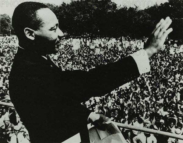 Dr. Martin Luther King, Jr. waving to the crowd from the steps of the Lincoln Memorial during the March on Washington, 1963.