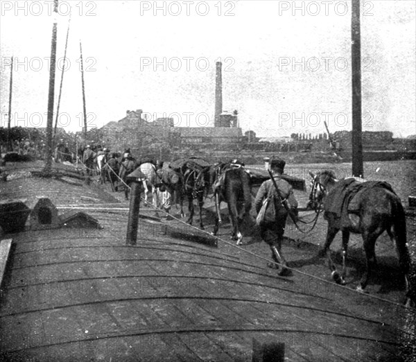 ''Devant les Falaises de L'Aisne; Un pont sur l'Oise improvise par le genie', 1914. Creator: Unknown.