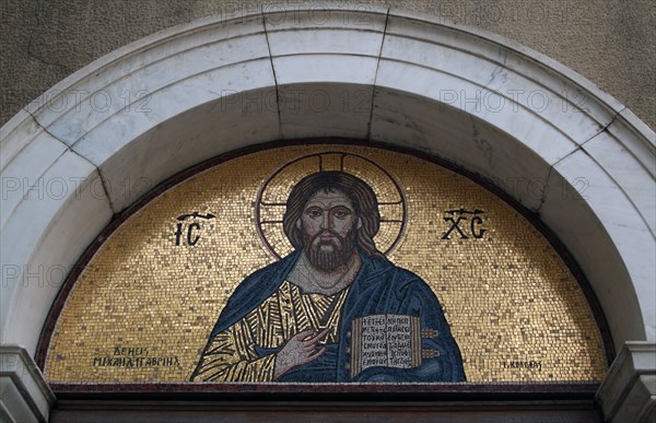 Gold mosaic detail of Jesus Christ from the Byzantine era, from the exterior of a Byzantine Church, Greece, 2003.