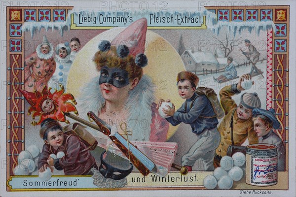Photo series Summer Joy and Winter pleasure, Winter time and carnival / Bildserie Sommerfreud und Winterlust, Winterzeit und Karneval, Liebigbild, digital improved reproduction of a collectible image from the Liebig company, estimated from 1900, pd / digital verbesserte Reproduktion eines Sammelbildes von ca 1900, gemeinfrei,.