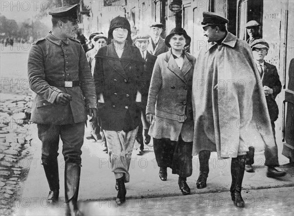 German soldiers walking with women in a Russian town during World War I ca. 1914-1915.
