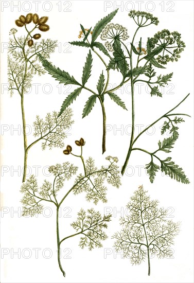 Botany, Plant, Field Chervil, Torilis arvensis or Caucalis arvensis, and variations lusitanica, tenuifolia, sylvestris, Historical, digitally restored reproduction from an original from the 18th century..