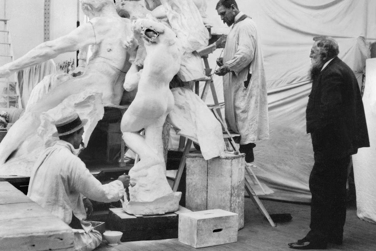 Le sculpteur français Auguste Rodin supervisant la réalisation du monument à Victor Hugo, qui lui a été commandé un an plus tôt. Atelier de Lebossé, 1890. Photo12/dpa-pa