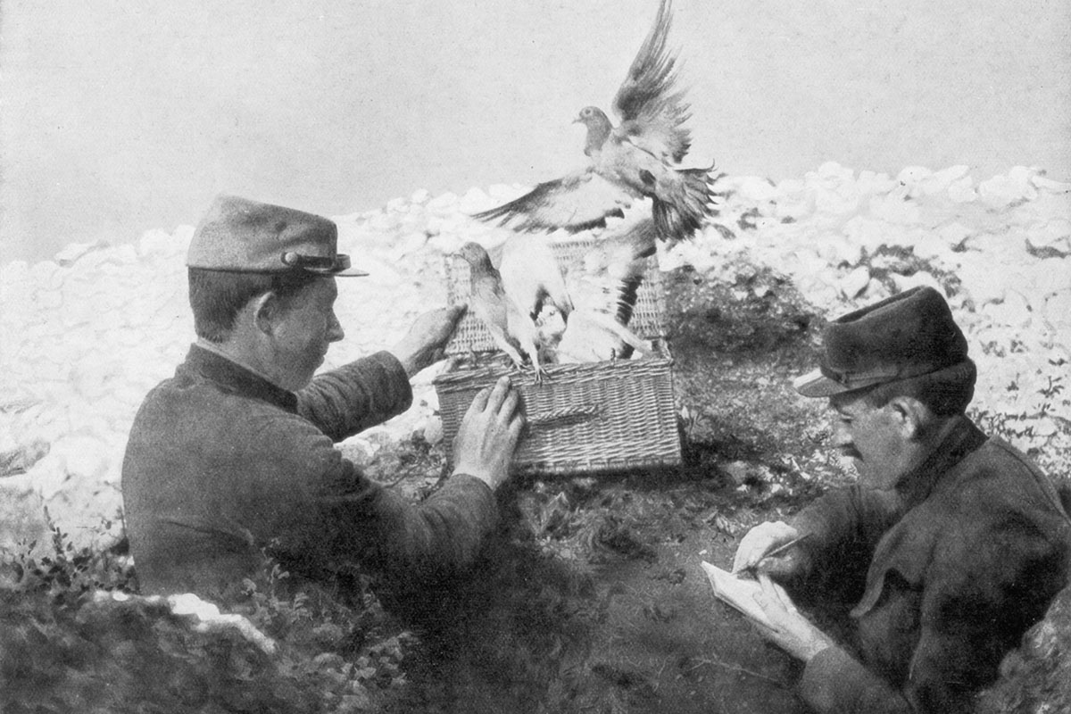 Avec 60 000 pigeons voyageurs mobilisés par l’armée française, ces oiseaux furent des messagers longue distance essentiels alors que les lignes téléphoniques et télégraphiques faisaient défaut.