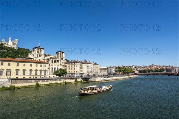 Barge on the Saone river past the cathedral Saint Jean, Lyon, Auvergne Rhone Alpes, France, Europe