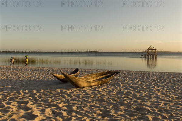 Dugout boat lying on sandy beach, Peninsula Masoala, Madagascar, Africa