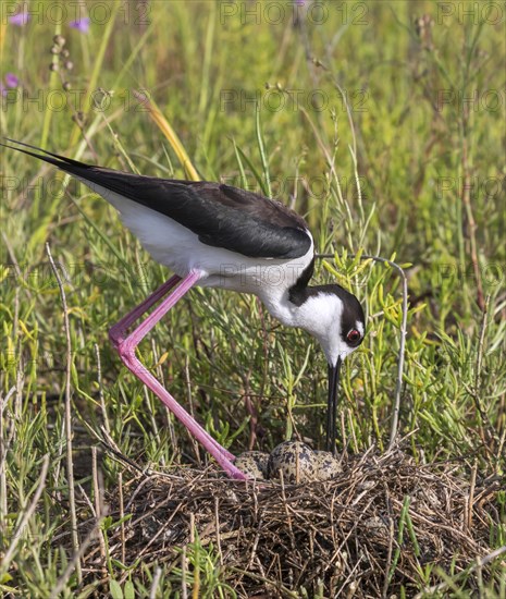 Black-necked stilt (Himantopus mexicanus) turning eggs in its nest, Galveston, Texas, USA, North America