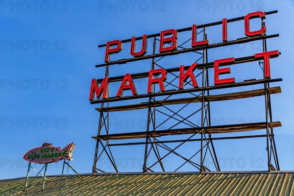 Sign at the entrance of Pike Place Public Market, Seattle, Washington, USA, North America