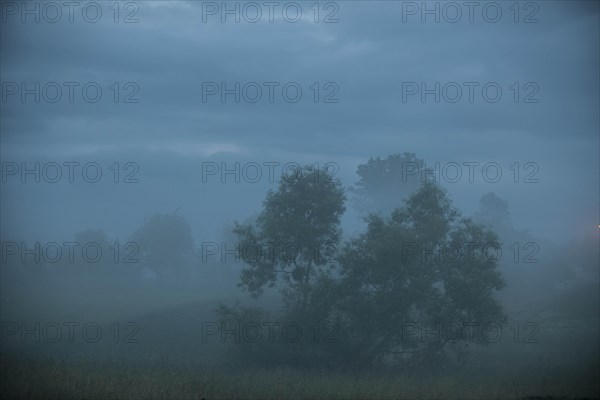 Morning mist over a meadow, near Galkowo, Warmian-Masurian Voivodeship or Warmia-Masuria Province, Poland, Europe
