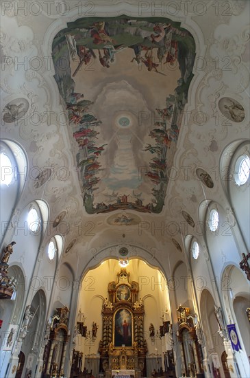Ceiling frescoes and choir, Parish church of Saints Peter and Paul, Lindenberg, Allgau, Bavaria, Germany, Europe