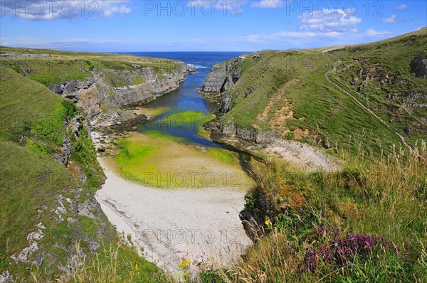 Sea inlet with a trail to a viewpoint at Smoo Cave, Durness, Caithness, Sutherland and Easter Ross, Scotland, United Kingdom, Europe