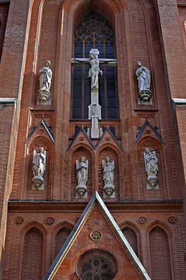 Western facade with figures of saints, St. John's Church, Au-Haidhausen, Munich, Upper Bavaria, Bavaria, Germany, Europe