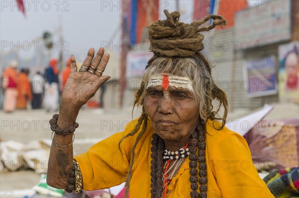 Shiva sadhvi, holy woman, at the Sangam, the confluence of the rivers Ganges, Yamuna and Saraswati, during Kumbha Mela festival, Allahabad, Uttar Pradesh, India, Asia