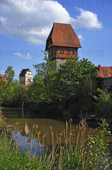 Baeuerlin Tower, watchtower, Woernitz River at front, Dinkelsbuhl, Middle Franconia, Bavaria, Germany, Europe
