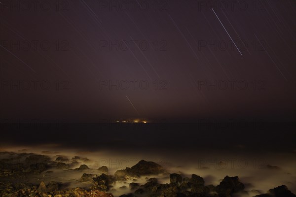 Star trails, exposed for 1 hour, coast with views towards the neighboring island of El Hierro, La Puntilla, Valle Gran Rey, La Gomera, Canary Islands, Spain, Europe