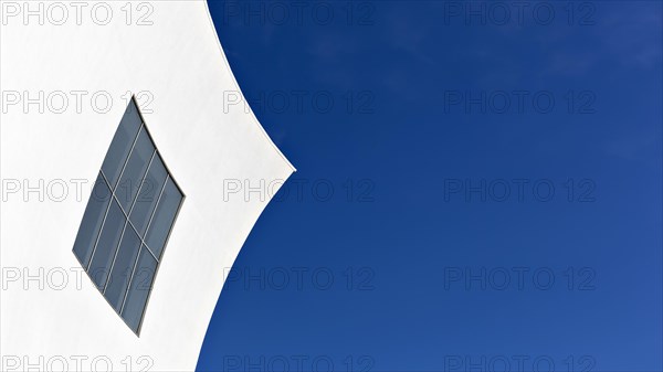 White concave facade with window against a blue sky, detail, Auditorium and Convention Center Infanta Dona Elena, Aguilas, Murcia, Spain, Europe