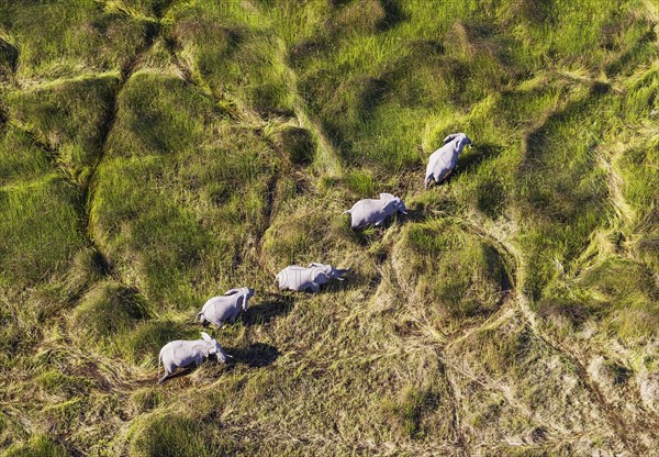 African Elephants (Loxodonta africana), cows, feeding in a freshwater marsh, aerial view, Okavango Delta, Botswana, Africa