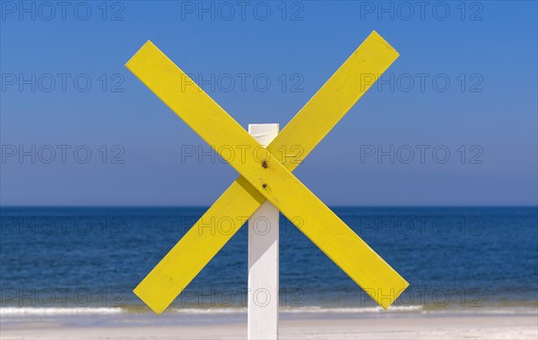 A yellow wooden cross marks a shoal near the shore at the beach, near Kampen, Sylt, Schleswig-Holstein, Germany, Europe